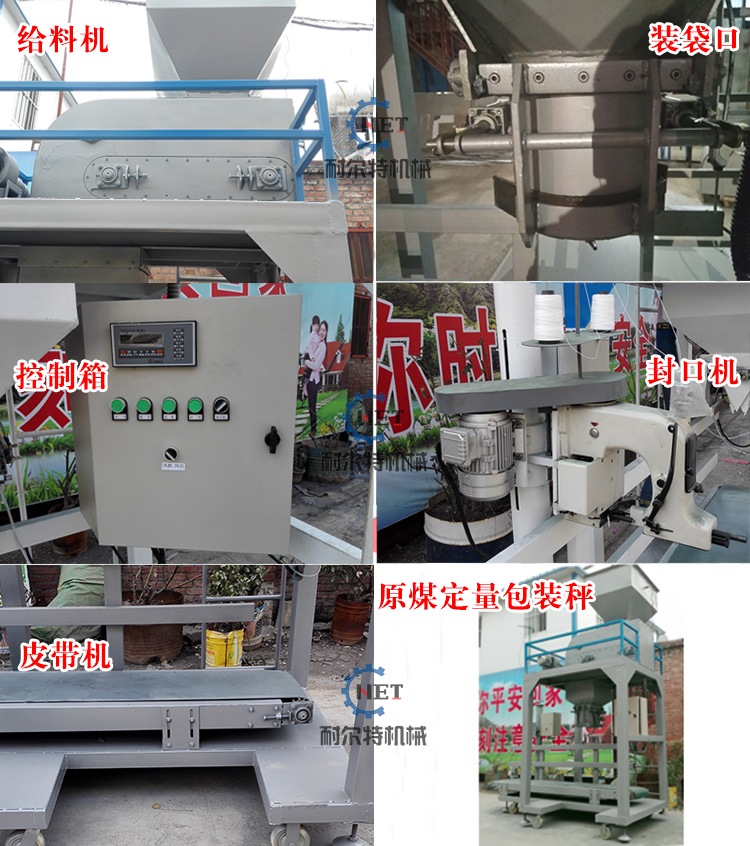 雙秤型煤定量包裝秤結構: 煤塊定量包裝機主要有進料斗,稱重斗,給料閘門,夾袋機構,機架,吸風口,氣動系統,傳感器,控制箱,輸送機和縫包機組成。結構簡便,操作簡單,運行穩定。