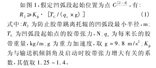 按國家煤礦輸送機的標準: 凹弧段半徑R2應滿足以下要求::皮帶輸送機在最不利的負載情況下啟動時,膠帶不跳離凹弧段上托輥。當受條件限制不能滿足上述要求時,可按連續輸送時膠帶不脫離凹弧段上托輥來決定R2在最不利負載下啟動時可加壓帶輪。基于以上所述,在設計皮帶輸送機凹弧段時,應設定一個適當的半徑,以使膠帶無論在任何情況下均能在槽形托輥上形成一個自然的凹槽。